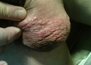 陰囊蛻皮是陰囊濕疹的一種現象,陰囊濕疹表現為陰囊部位老是潮潮的,略有些癢。按疾病的發展過程可分為急性期、亞急性期、慢性期三個過程。急性發作時,癥狀多為陰囊皮膚潮紅、瘙癢、有丘疹,瘙癢撓得多了,能露出光滑的紅色皮膚。亞急性發作時,癥狀為陰囊劇烈瘙癢,不思飲食,大便稀,小便黃,有時有水皰輕度糜爛。慢性發作時,瘙癢時斷時有,精神緊張、飲酒、食辛辣食物時瘙癢加劇,陰囊皮膚摸起來較硬,皮膚表面顏色呈暗紅或紫褐色,這種病是皮膚病之一,又是男科病的一種身材較胖、局部多汗者易患此病,以中老年男性患者居多。