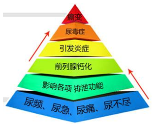 逐漸增大的前列腺腺體壓迫尿道可引起進行性排尿困難,表現為尿線細、射程短、尿流緩慢、尿流中斷、尿后滴瀝、排尿不盡、排尿費力,此外,還有尿頻、尿急、夜尿增多、甚至尿失禁。腫瘤壓迫直腸可引起大便困難或腸梗阻,也可壓迫輸精管引起射精缺乏,壓迫神經引起會陰部疼痛,并可向坐骨神經放射。