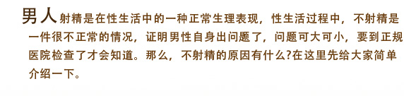 不射精癥又稱射精不能,是指具有正常的性欲,陰莖勃起正常,能在陰道內(nèi)維持勃起及性交一段時(shí)間,甚至很長(zhǎng)時(shí)間,但無(wú)性高潮出現(xiàn),且不能射精。據(jù)西方著名性學(xué)家馬斯特斯和約翰遜的調(diào)查,450名男性性功能障礙患者,其中有17名不射精,占8%;"中國(guó)醫(yī)學(xué)會(huì)男科學(xué)分會(huì)的有關(guān)研究報(bào)告表明:在2087例男性不育癥患者中,不射精者占32.39%。可見,不射精已成為影響男性性福、阻礙男人生育的一大因素。"